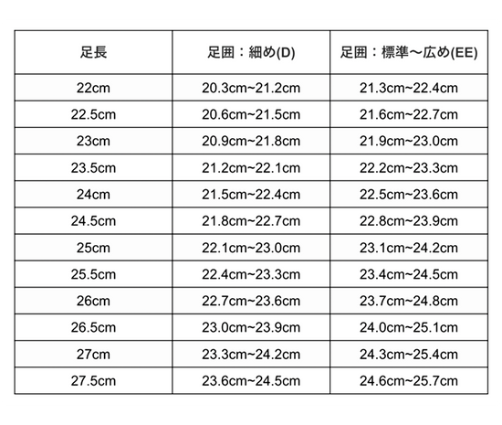 kutsulabの靴は、サイズを22.0cm~27.5cmまで、幅も細め(D)と標準〜広め(EE)の2種類を用意しております。(mustaはEEのみ)